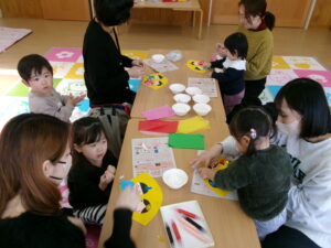 紙芝居を見たり、『うれしいひなまつり』の歌を歌った後、おかあさんと一緒に おひなさま作り💕
